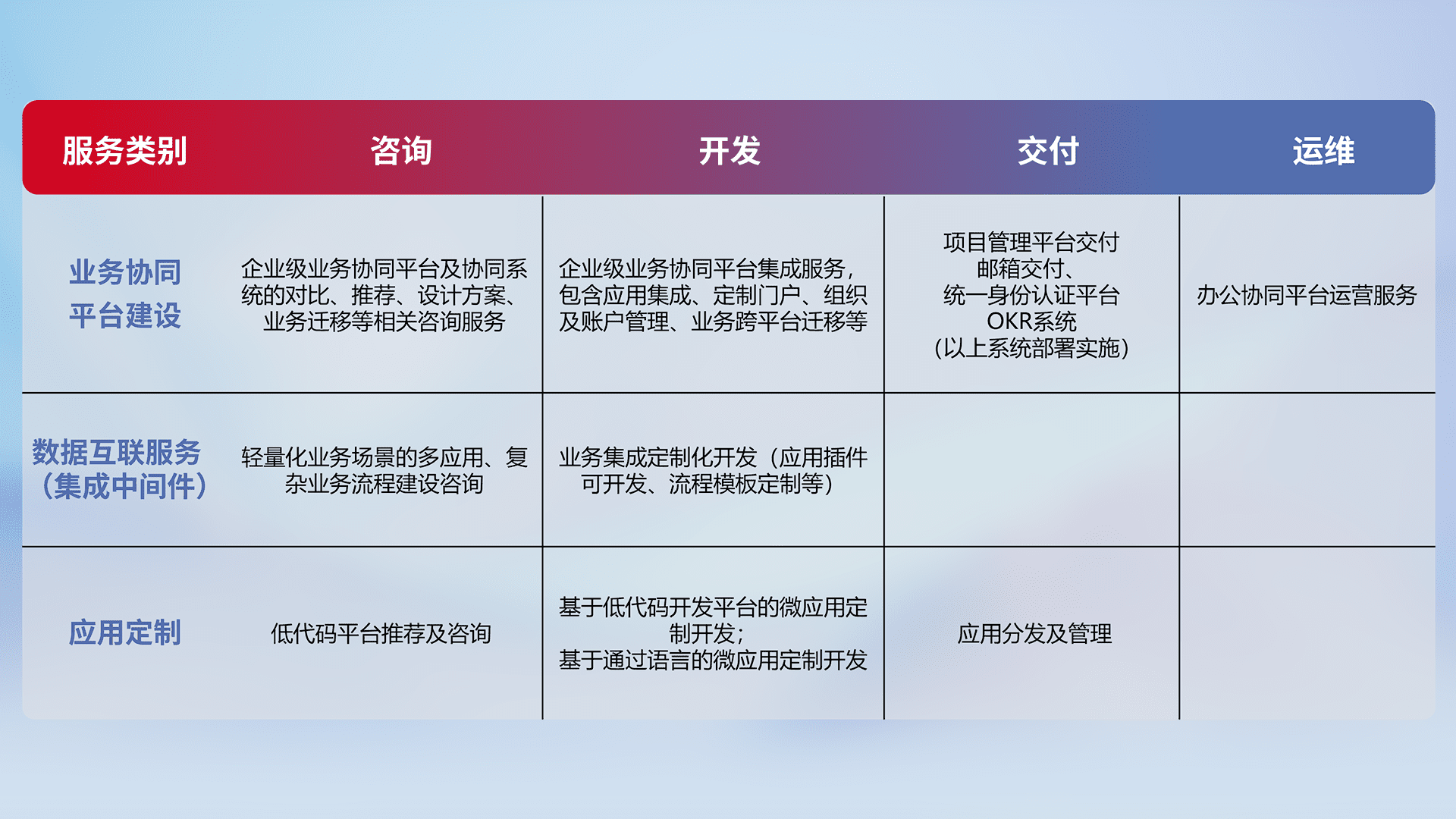 针对钉钉、、企微、、、、IDaas等平台级产品提供产品的规划、、方案、、、交付、、定制化开发等服务,,,实现如统一协同办公、、、、智能客户服务、、、混合会议管理、、、、智能数据查询、、等业务场景,,实现数字化转型。。。。